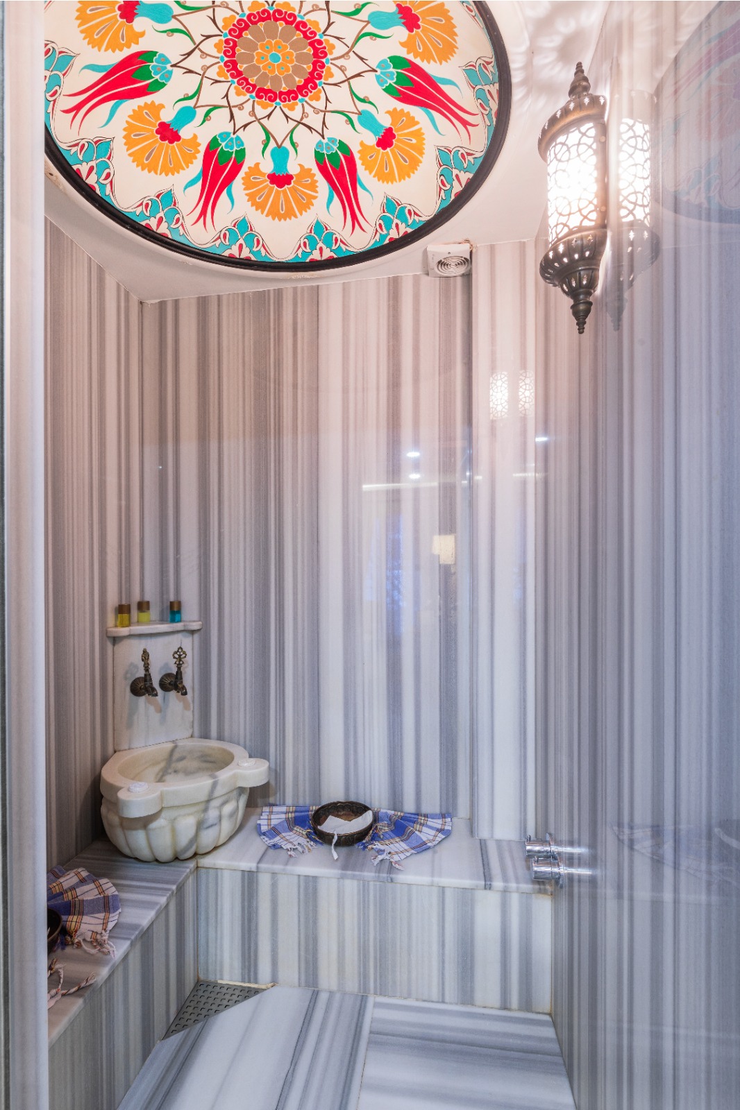 This room has a private bathroom with shower and another private bathroom comes with a Turkish hammam designed in a refined new style with an artist’s touch and finished with high-quality all-natural materials. Turkish hammam has heated traditional Marmara marble floor.